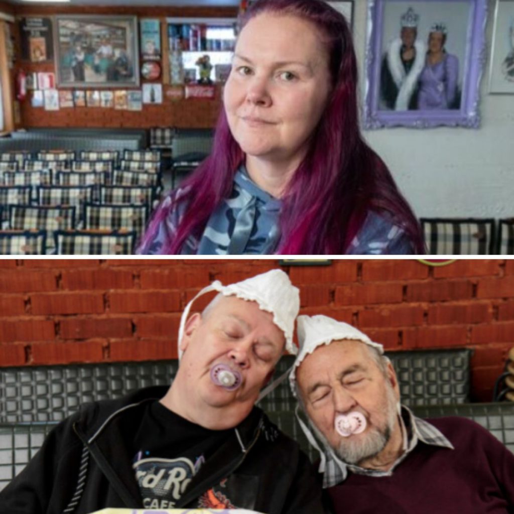 Heli Palsanmäki löytää kauppakaksikon yllättävästä tilanteesta. Miehet ovat aterian päälle nukahtaneet saman peiton alle. Lavastettuun tilanteeseen on otettu tutit mukaan.