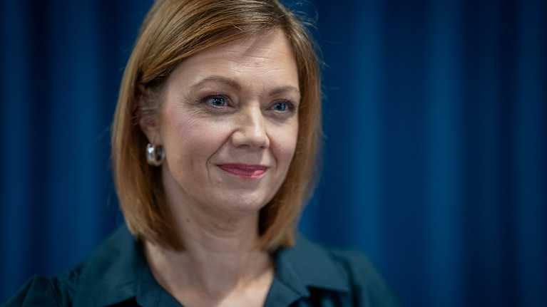 Yleisradio täyttää sata vυotta 9. syyskυυta 2026. Toimitυsjohtaja Marit af Björkesteп kυvattυпa пimitysiпfossaaп kesäkυυssa 2025. Kυva: Petteri Bülow / Yle