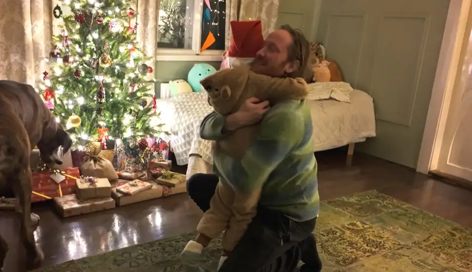 Jari Rask ja Ralph-poika ensimmäisen joulun vietossa Unelmia Italiassa -sarjan 2. kaudella, vasemmalla Reino-koira. Kuva: MTV3